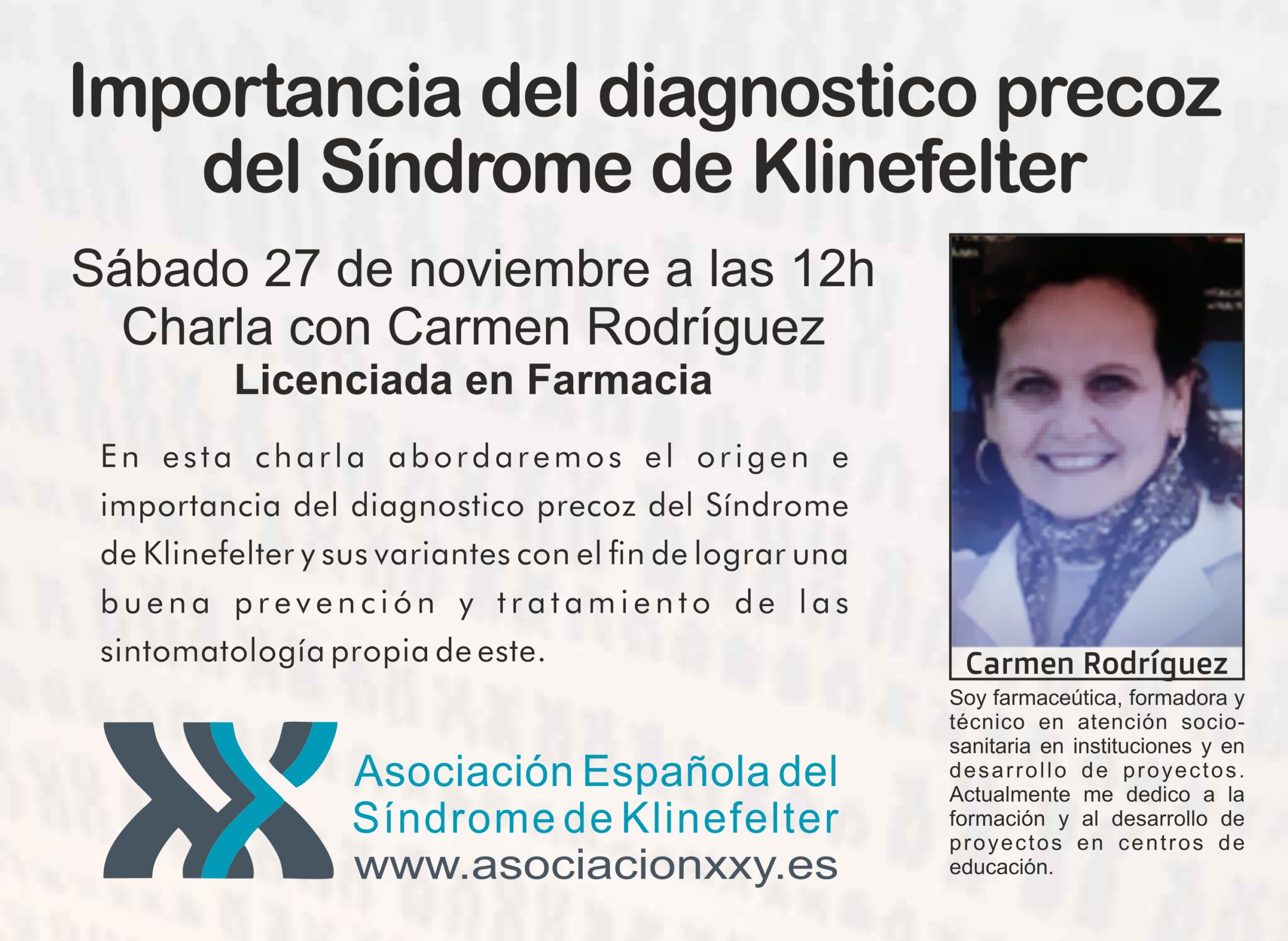 El próximo sábado 27 de noviembre compartiremos charla con Carmen Rodríguez, Licenciada en Farmacia. En este encuentro hablaremos sobre la importancia del diagnóstico precoz del Síndrome […]
